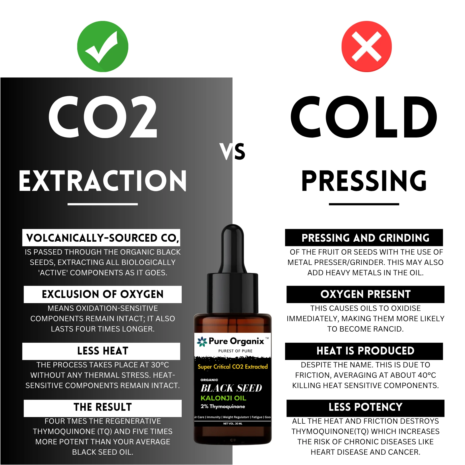 Cold pressing squeezes oil out but can lose many important nutrients due to heat and air exposure. Pure Organix SC-CO2 oil contains 3-4 times more thymoquinone and active ingredients, so it works better and lasts longer.